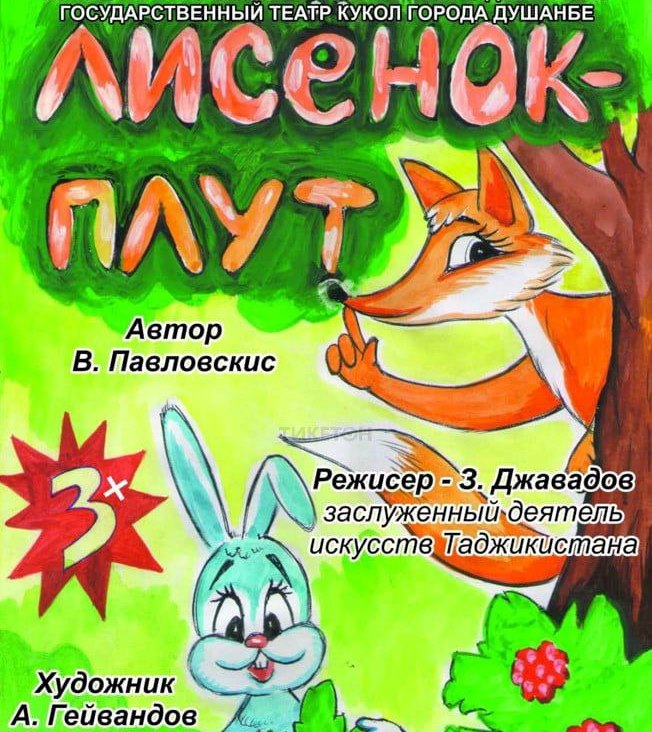 — В Государственном республиканском театре кукол «Лухтак» в 11:00 состоится показ спектакля «Лисёнок Плут» в постановке Зафара Джавадова. История повествует о плутишке и обманщике лисёнке, живущем в лесу. Он обманул медвежонка и зайчонка, но они объединяются и решают проучить обидчика. Все герои попадают в различные приключения, а финал узнает тот, кто придёт на спектакль. Перед началом спектакля в фойе первого этажа состоится «Шоу-концерт с куклами».