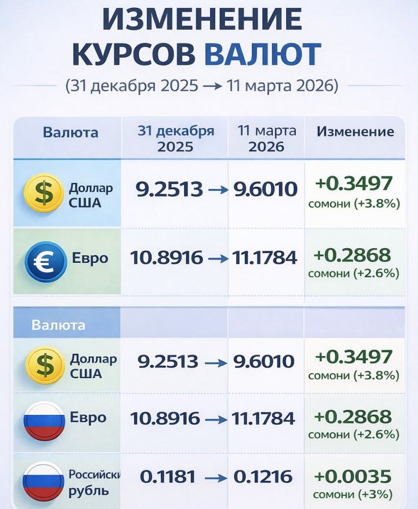 После военного вторжения в Иран (28 февраля) курс доллара вырос с 9,5109 до 9,6010 сомони, увеличившись примерно на 0,9%.