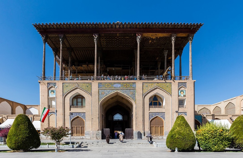 Дворец был построен по приказу шаха Аббаса I. С его большого деревянного балкона правители наблюдали за церемониями, военными парадами и игрой в чоуган — древнюю персидскую игру, ставшую прообразом современного поло.