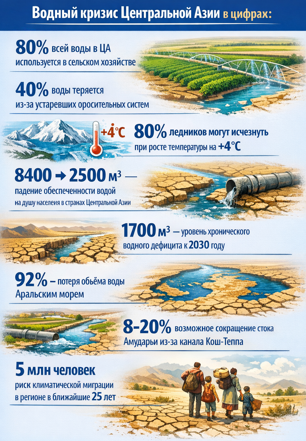 В докладе, опубликованном в феврале 2026 года, New Lines Institute предупредил: «Дефицит воды превращается в одну из ключевых угроз экономическому развитию и стабильности Центральной Азии».