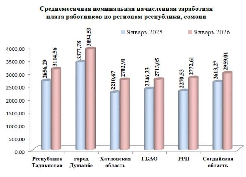 Среднемесячная номинальная заработная плата в Таджикистане, начисленная в январе 2026 года, сложилась в размере 3114,56 сомони (около $325), сообщает статистическое ведомство страны. Это на 17,3% больше по сравнению с январем 2025 года.