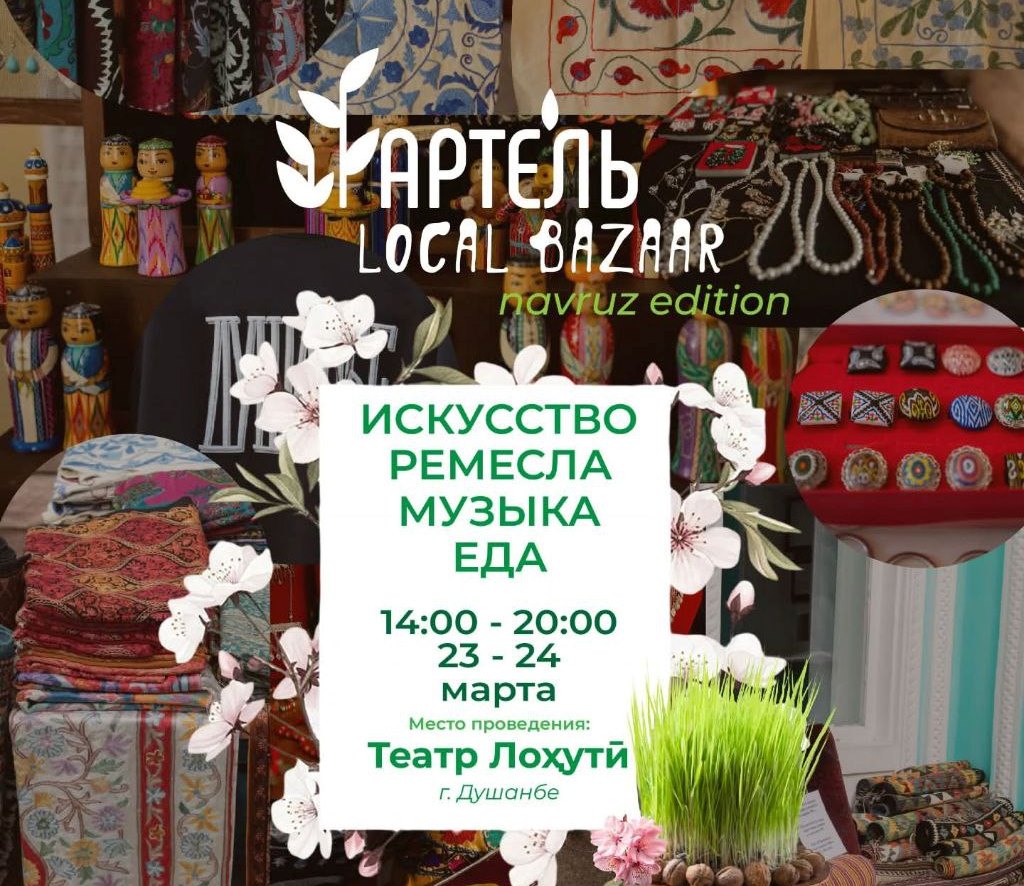 — В здании театра им. А. Лохути с 14:00 до 20:00 пройдёт уникальная ярмарка ремесленников Artel Local Bazaar – Navruz edition. Ярмарка организована одновременно в фойе театра и на прилегающей аллее, что создаст больше пространства для прогулок, встреч и открытий. На Artel Local Bazaar можно не только приобрести уникальные изделия, но и лично познакомиться с авторами, увидеть процесс создания и напрямую поддержать локальное производство. Приходите с друзьями и семьей, чтобы провести выходные в атмосфере творчества и светлого праздника Навруз.