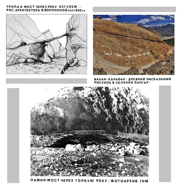 Вахан – караван на горной тропе, древний наскальный рисунок в селении Лангар. Внизу мост через горную реку. Фотоархив ГИМ начала ХХ в.