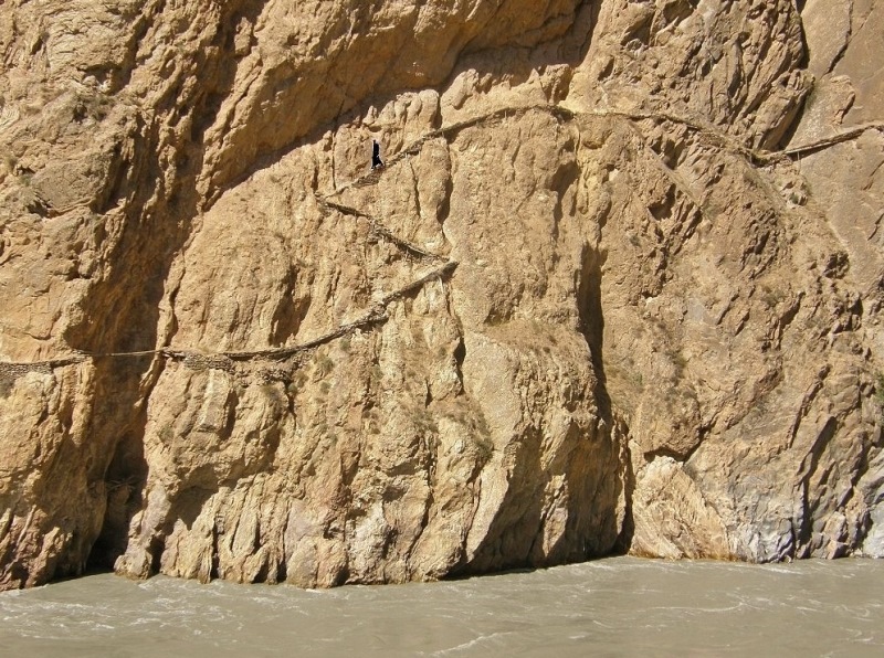 «Бревна, вбитые в расщелины скалы, подозрительно поскрипывают как живые, заставляя даже привычных лошадей нервно вздрагивать перед дырами в настиле, сквозь которую виднелась страшной глубины пропасть», – описал в 1910 году такую тропу русский исследователь Дмитрий Логофет.