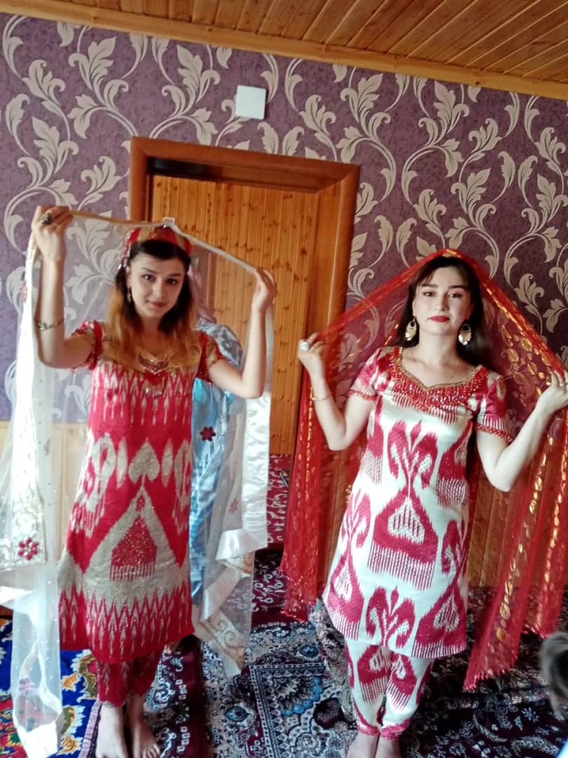 С хной на руках, с подкрашенными усмой бровями, в платьях из атласа и чакана, они приходят в гости. Невесты встречают их традиционным приветствием и приглашают в украшенный дом.