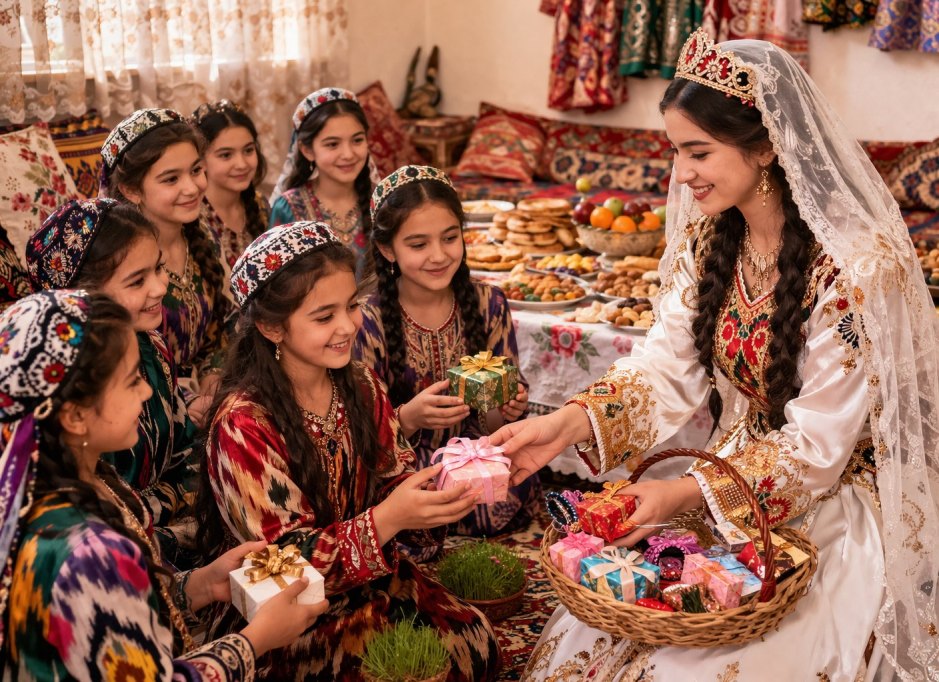 Рано утром 7 марта семьи, в которых есть молодые невесты, широко открывают ворота и ждут гостей. Невесты надевают свои лучшие наряды, украшают себя и покрывают голову тюбетейкой и кружевным покрывалом.