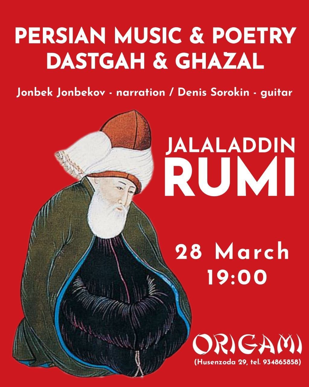 В программе: стихи Джалолиддина Руми на фарси под музыку иранского дастяха. Джонбек Джонбеков – декламация, Денис Сорокин – гитара. Приходите, чтобы провести вечер в необычной, но тёплой атмосфере, а может даже получить вдохновение.