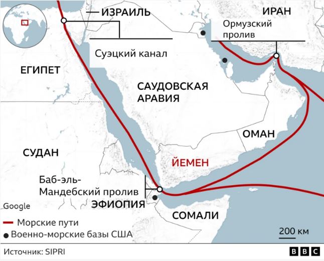 Большая часть нефти направляется в Азию через Баб-эль-Мандебский пролив, который два года назад блокировали хуситы — шиитская группировка, контролирующая значительную часть Йемена при поддержке Ирана.