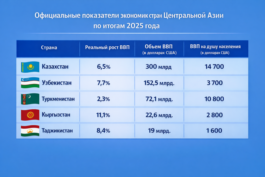 По данным национальных статистических ведомств стран региона (по Туркменистану данные МВФ), наиболее высокий рост продемонстрировала в 2025 году экономика Кыргызстана (11,1%), а самый скромный – экономика Туркменистана (2,3%).