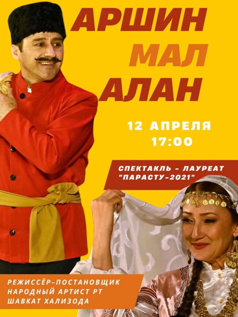 В Государственном академическом театре оперы и балета им. С. Айни 12 апреля в 17:00 состоится показ комедийного музыкального спектакля Узейира Гаджибекова «Аршин мал алан». История разворачивается в начале XX века и повествует о четырех парах страстно влюбленных сердец. По традиции, жених не имеет права увидеть невесту до свадьбы, но знатный купец Аскар готов пойти против вековых обычаев, — с этого решения и начинается увлекательная путаница, в которую вовлекается всё больше персонажей. А они, как на подбор — обаятельные и неотразимые!