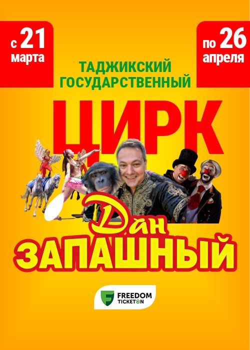 В Государственном цирке Таджикистана по субботам и воскресеньям до 26 апреля в 16:00 проходят выступления гостей из России — Дана Запашного и компании. Звезда российского цирка, легендарный дрессировщик Дан Запашный приезжает в Душанбе впервые, а вместе с ним выступят лучшие цирковые артисты России и Белоруссии – многократные призёры престижных мировых фестивалей и конкурсов. Вас удивят полёты воздушных гимнастов под куполом цирка, невероятные трюки акробата на колесе смелости, захватывающие выступления бесстрашных девушек-наездниц на лошадях группы «Nomad», а настроение детей и взрослых поднимет клоун московского цирка. Кульминация шоу — выступление – самого Запашного и шимпанзе Бони.