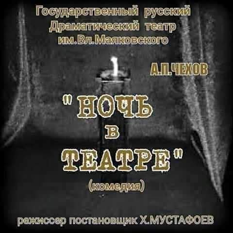 На сцене Государственного русского драматического театра им. В. Маяковского 11 апреля в 14:00 в честь прошедшего праздника Навруз пройдёт постановка «Ночь в театре» от режиссёра Хуршеда Мустафаева. Спектакль собран по мотивам пьес А.П. Чехова «Лебединая песня», «Медведь» и «Предложение».
