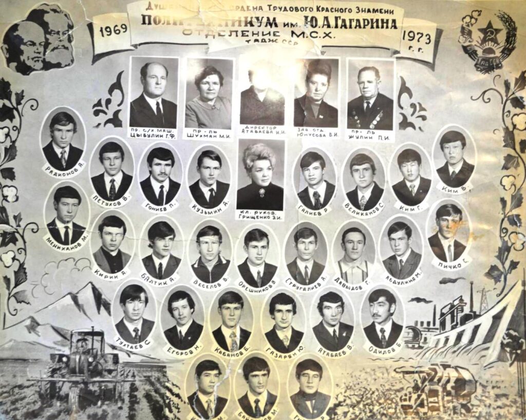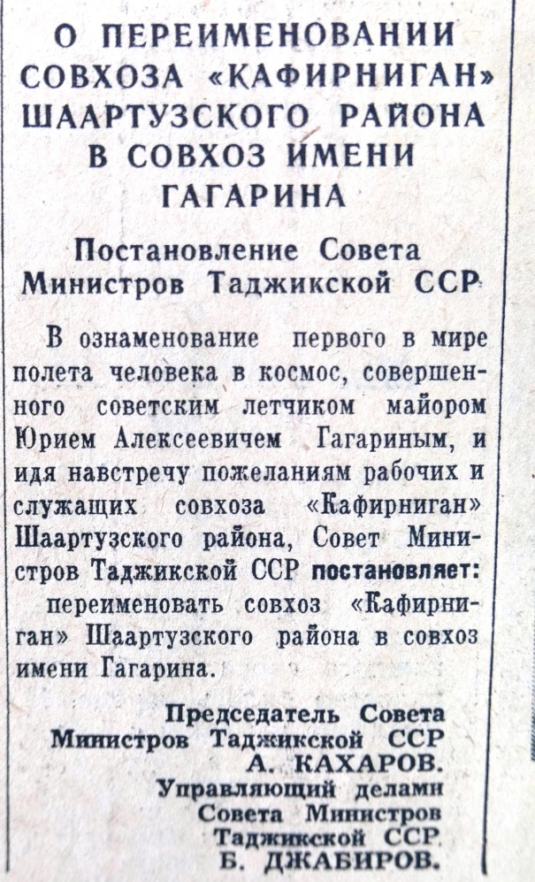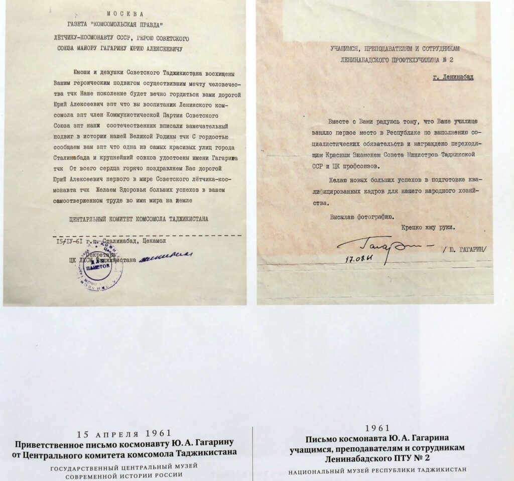 В Национальном музее Таджикистана хранится письмо Гагарина учащимся и преподавателям Ленинабадского ПТУ №2. 1961 г. Фото из архива Гафура ШерматоваПравительственное сообщение о полете Юрия Гагарина в космос. Вырезка из журнала «Таджикистан». Фото из архива Гафура ШерматоваВ сталинабадском родильном доме №1, 15 апреля 1961 года. Фото из архива Гафура ШерматоваПередовица газеты «Коммунист Таджикистана». Фото из архива Гафура ШерматоваПередовица газеты «Точикистони Совети». Фото из архива Гафура ШерматоваМосква, 1962 год. Групповое фото Юрия Гагарина с депутатами Верховного Совета Таджикской ССР. Фото из архива Гафура ШерматоваПостановление Совета Министров Таджикской ССР о переименовании совхоза «Кафирниган» в совхоз им. Гагарина. Фото из архива Гафура ШерматоваВиньетка выпускников душанбинской средней школы №21 им. Ю. А. Гагарина. Душанбе, 1971 год. Фото из архива Гафура ШерматоваВиньетка выпускников Душанбинского политехникума им. Ю. А. Гагарина. Душанбе 1973 год. Фото из архива Гафура ШерматоваПамятник покорителям космоса в душанбинском аэропорту. Фото Гафура Шерматова Один из домов на улице ГагаринаФото из архива Гафура ШерматоваРазговор со звездами. Скульптурная композиция, установленная на трассе Душанбе – Бохтар (Курган-Тюбе), автор – заслуженный деятель искусств Таджикской ССР Григорий Чередниченко. Фото из архива Гафура ШерматоваПионерский лагерь «Космос» близ Душанбе. 1974 год. Фото из архива Гафура ШерматоваЗначок Душанбинского политехникума им. Гагарина. Душанбе, 1982 год. Фото Гафура Шерматова