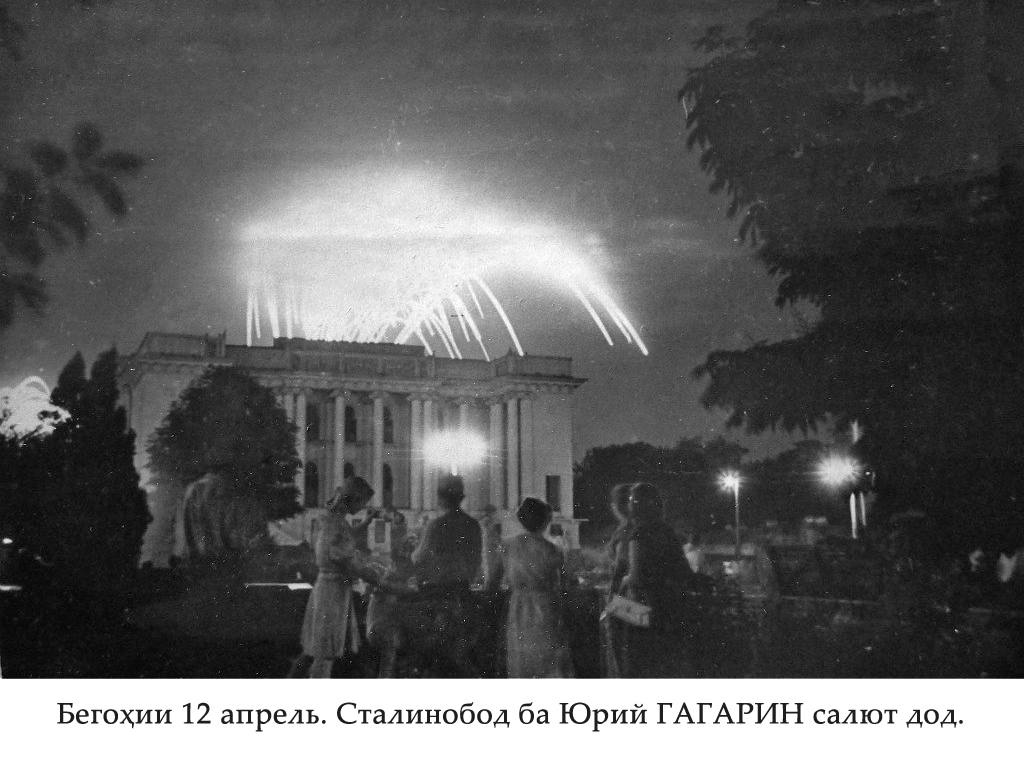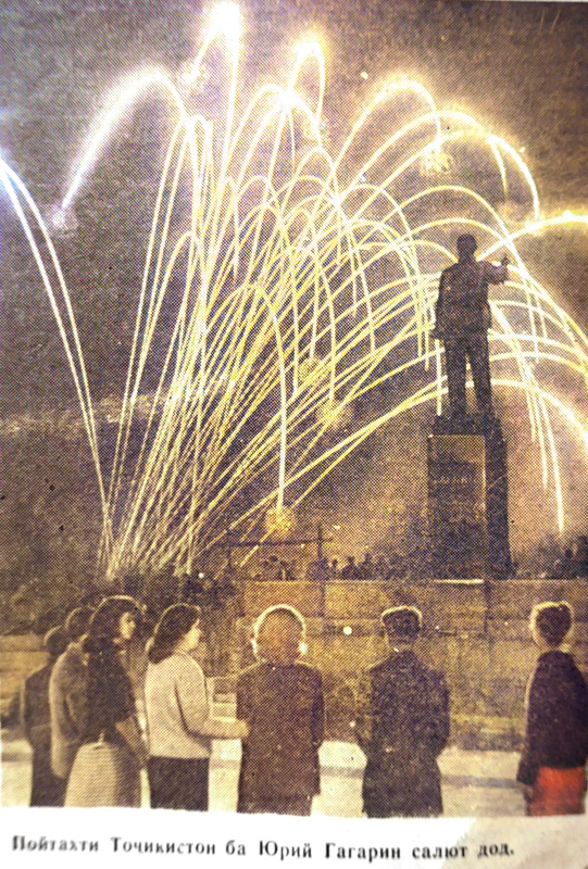 Душанбинцы от всей души поздравляли друг друга с первым полетом человека в космос. А уже вечером над Сталинабадом один за другим прогремели 20 залпов орудийного салюта в честь Юрия Алексеевича Гагарина, и небо озарилось разноцветными огнями ракет салюта, тысячи душанбинцев вышли на площади и улицы города, еще и еще раз поздравляя друг друга с осуществлением первого в мире полета в космическое пространство.