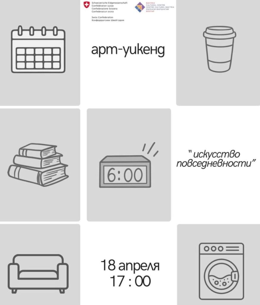 В КЦ «Бактрия» 18 апреля в 17:00 пройдет арт-уикенд «Искусство повседневности». На уникальной выставке гостям будут показаны различные фотографии и инсталляции, отражающие ежедневные мелочи, которые кроют в себе красоту. Также пройдут обсуждения, и всё это — под музыкальный перформанс. В программе — живое выступление Ирины Дмитриевой-Ванн.