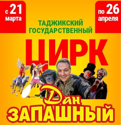 В Государственном цирке Таджикистана по субботам и воскресеньям до 26 апреля в 16:00 проходят выступления гостей из России — Дана Запашного и компании. Звезда российского цирка, легендарный дрессировщик Дан Запашный приезжает в Душанбе впервые, а вместе с ним выступят лучшие цирковые артисты России и Беларуси — многократные призёры престижных мировых фестивалей и конкурсов. Вас удивят полёты воздушных гимнастов под куполом цирка, невероятные трюки акробата на колесе смелости, захватывающие выступления бесстрашных девушек-наездниц на лошадях группы Nomad, а настроение детей и взрослых поднимет клоун московского цирка. Кульминация шоу — выступление самого Запашного и шимпанзе Бони.