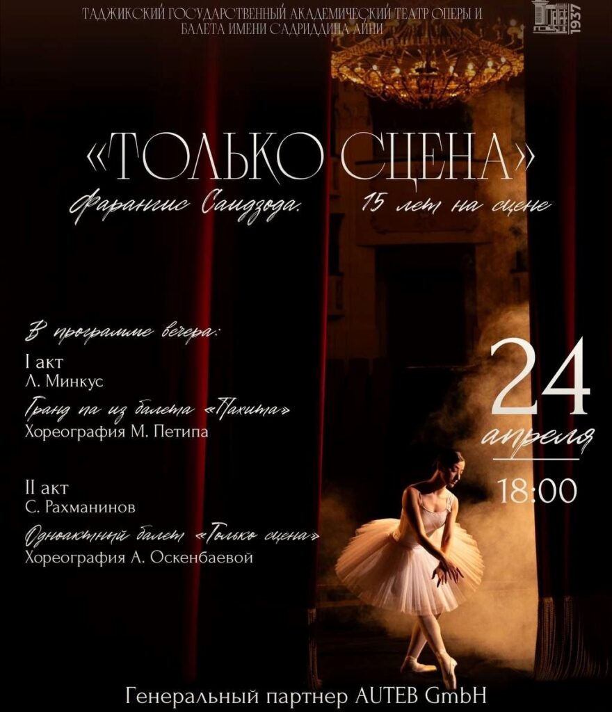 На сцене Государственного академического театра оперы и балета им. С. Айни 24 апреляв 16:00 состоится премьера одноактного балета «Только сцена». Это история в танце о девушке, которая решает слушать своё сердце вопреки всему. Она сталкивается с недопониманием общества, мужа и семьи, где на каждом шагу звучит вопрос: «Да какой ты будешь женой?» — и где её мечта танцевать свободно кажется почти невозможной. На её пути — реальность, казалось бы, не оставляющая надежды… Но рядом всегда ощущается присутствие невидимой силы — Духа сцены, который ведёт её к истине, сквозь сомнения и страхи.