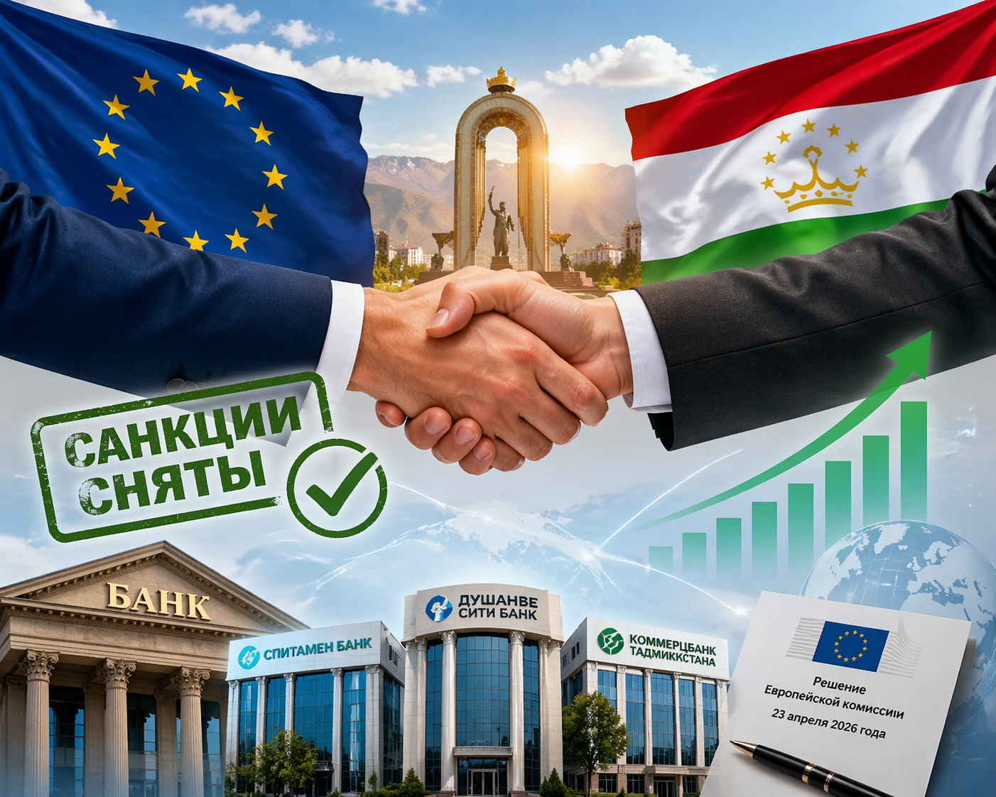В НБТ подчеркнули, что Европейская комиссия в рамках своего решения от 23 апреля 2026 года, которое относится к 20‑му пакету санкций Евросоюза, исключила три финансовые кредитные организации страны: ОАО «Спитамен Банк», ОАО «Душанбе Сити Банк» и ОАО «Коммерцбанк Таджикистана», которые находились в 19‑м пакете санкций, из санкционного списка.
