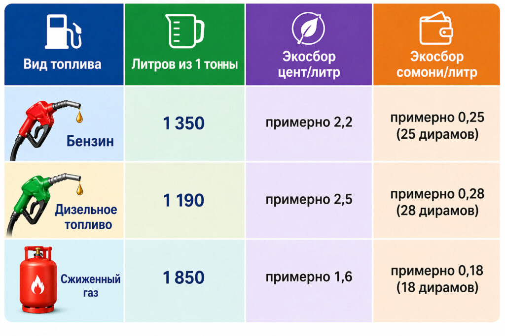 Между тем, ранее на портале правовой информации Минюста страны было опубликовано постановление правительства РТ «Об утверждении ставок сбора за осуществление юридически значимых действий и платы за выдачу разрешения на пользование природными и иными имеющимися ресурсами». Ставка экологической платы в соответствии с этим документом для «минерального топлива, нефти и продуктов переработки нефти, битумных веществ и минеральных восков» установлена в размере 30 евро (331 сомони по официальному курсу НБТ на 27.04.2026) за каждую тонну независимо от вида топлива.
