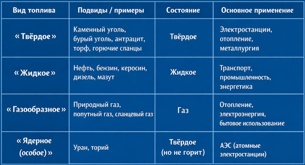 К минеральному топливу относится нефть и продукты из нее, природный газ, уголь и некоторые другие природные горючие вещества, которые добываются из недр земли.