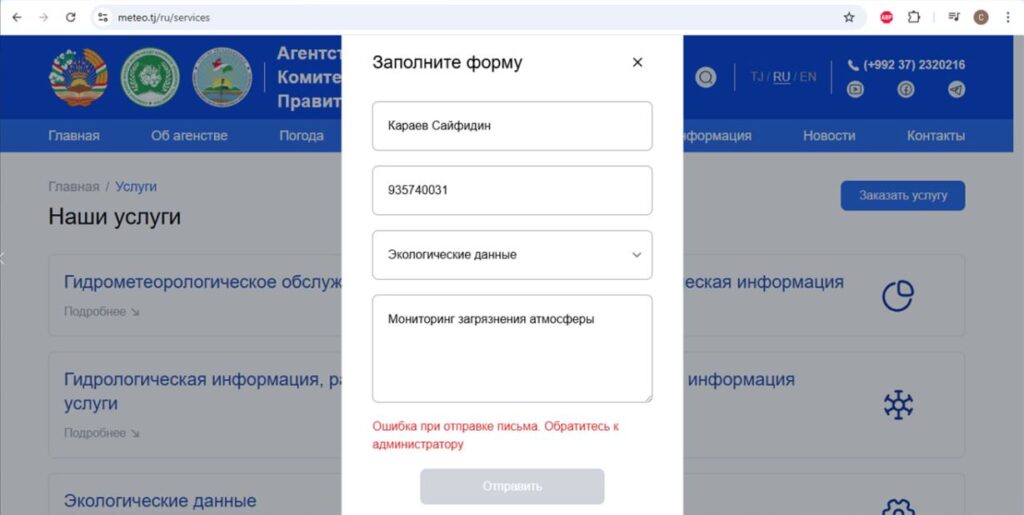 Нажимаем кнопку – заказать услугу. При нажатии появляется форма для заполнения: