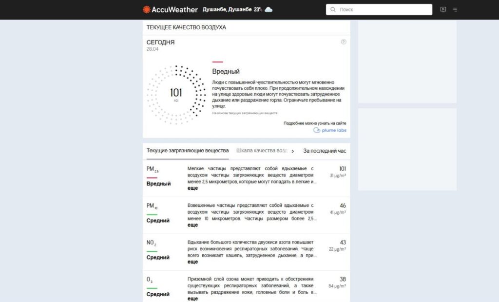 Для получения информации о загрязнении воздуха граждане часто обращаются к международным платформам, таким как IQAir, AQI.in, Air Quality, AccuWeather и другим. Эти ресурсы предоставляют данные о состоянии воздуха в реальном времени для различных городов мира, в том числе, и Таджикистана.