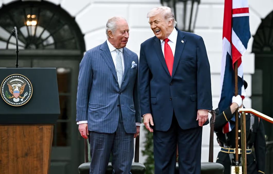 На фотографии, сделанной во время официального приветствия Карла III и королевы Камиллы, подписанной «TWO KINGS», президент Трамп и король смеются, стоя на лужайке у Белого дома.