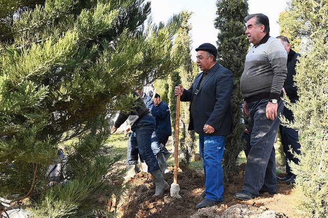 According to the Dushanbe administration press center, members of the government and senior representatives of president’s executive office joined Rahmon in planting trees in Dushanbe.