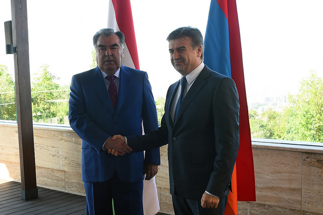 Tajik President Emomali Rahmon today met in the Armenian capital, Yerevan, with Armenian Prime Minister Karen Karapetyan.