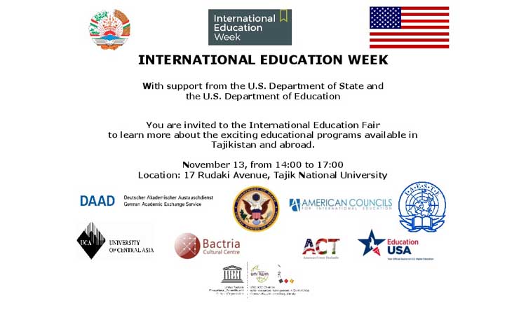 To help celebrate this event, the U.S. Embassy in Dushanbe will host an Education Fair at the Tajik National University on November 13, 2017 from 2:00 to 5:00 p.m. with a range of educational organizations including: American Councils, EducationUSA, Bactria Cultural Center, University of Central Asia, Aga Khan Foundation, American Corner Dushanbe, DAAD, UNESCO Chair on water resources management in Central Asia at the German-Kazakh University, and the International Association for the Exchange of Students for Technical Experience.