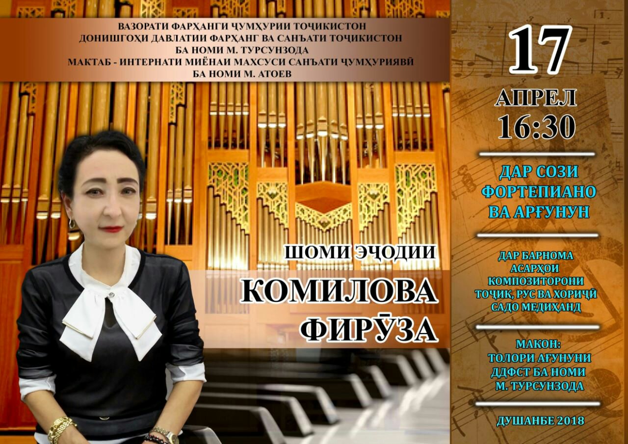 A recital of Tajik musician Firouza Komilova will take place at a concert hall of Tajik Institute of Art. She will play works on organ and piano. Starting time: 4:30 pm; entrnce is free of charge.