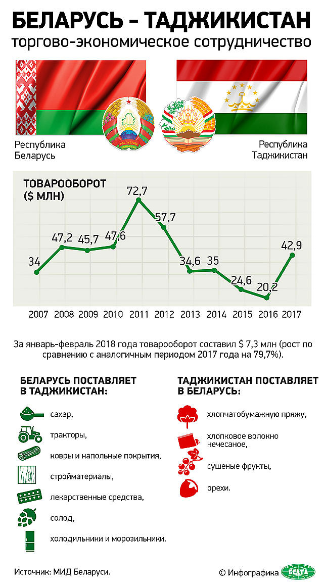 According to data from the Agency for Statistics under the President of Tajikistan, a two-way trade between Tajikistan and Belarus last year valued at some 40 million U.S. dollars, which was nearly 90 percent more than in 2016. This consisted of Tajikistan’s exports to Belarus estimated at US$4 million and Tajikistan’s imports from Belarus worth some US$37 million.
