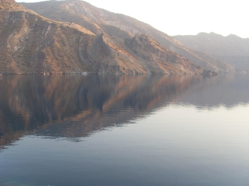 This is the maximum filling level of the Nurek reservoir: it has a normal retaining level of 910 meters.
