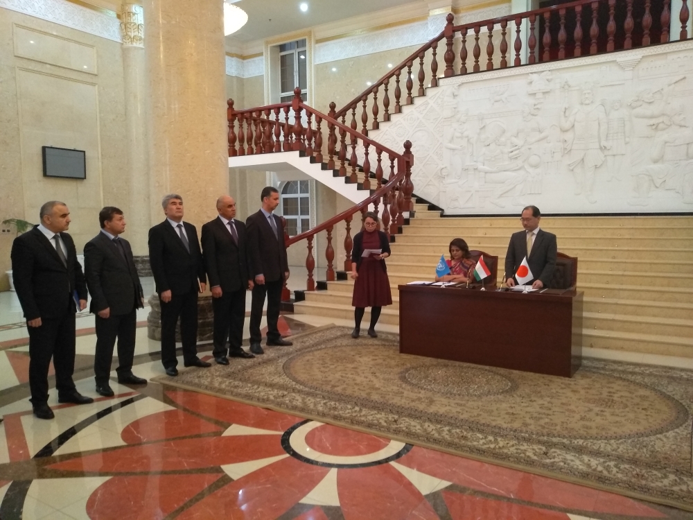 The Agreement was signed by Mr. Hideki Tanabe, Chief Representative of the Japan International Cooperation Agency (JICA) Tajikistan Office and Dr. Pratibha Mehta, UN Resident Coordinator also UNDP Resident Representative in Tajikistan. Representatives of the Government of Tajikistan, namely the Deputy Minister of Foreign Affairs, the First Deputy Commander of Border Troops, the Deputy Chairman of Customs Services under the Government of Tajikistan, the Deputy Chairman of Drug Control Agency under the President of Tajikistan and others attended the ceremony.