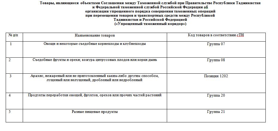 In accordance with the annex to the agreement, the following goods can pass through the Tajikistan-Russia simplified corridor: