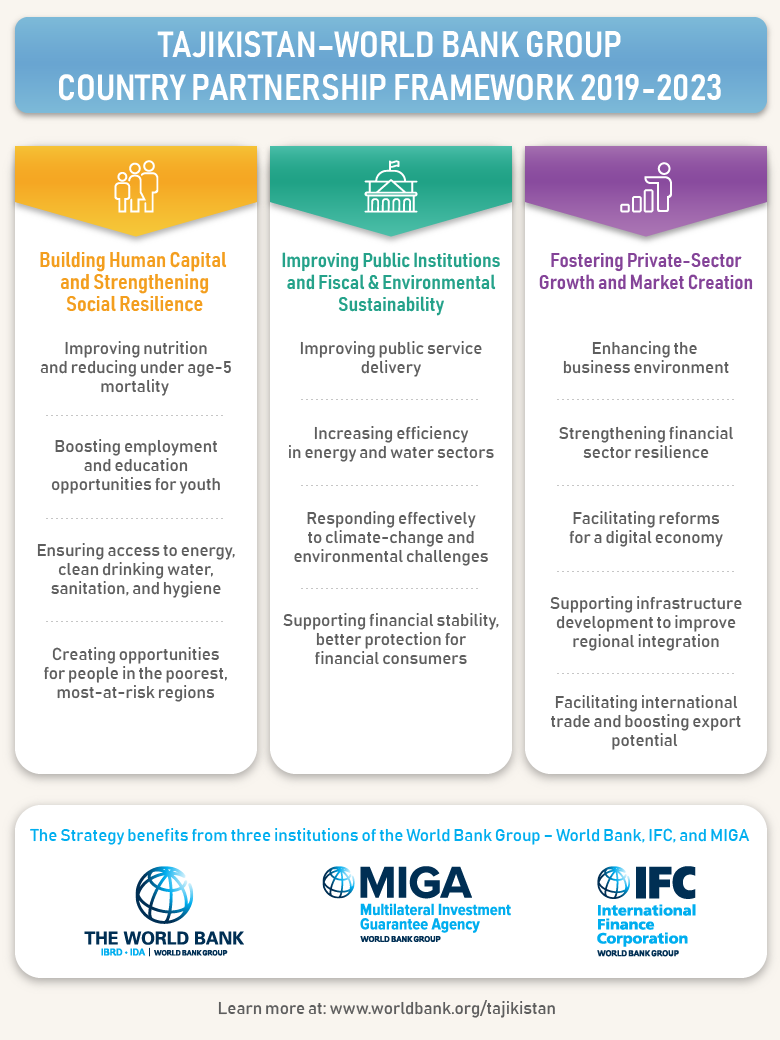 The World bank will support Tajikistan in achieving sustained economic growth, boosting exports, and creating more and better jobs for its citizens, through enhanced private-sector development and greater investment in human capital and public services.