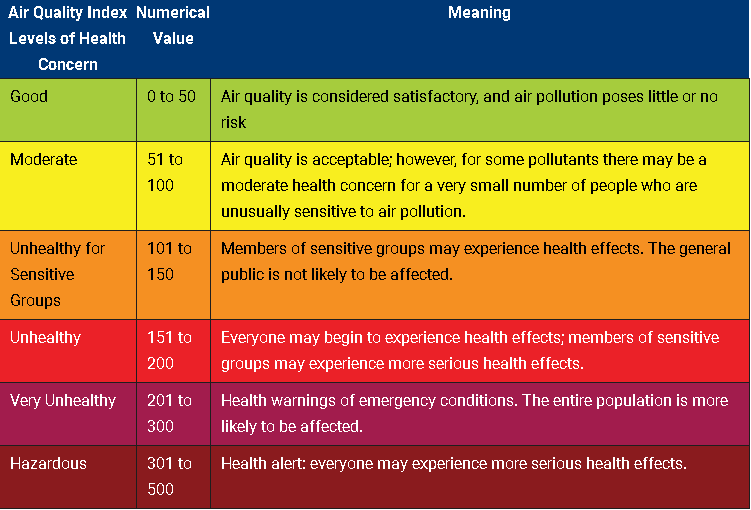The U.S. EPA has developed a formula to convert PM 2.5 readings into an air quality index (AQI) value that can help inform health-related decisions. For example, an AQI value of 50 represents good air quality with little potential to affect public health, while an AQI value over 300 represents hazardous air quality. For more information on AQI and how it is calculated, please click here: https://bit.ly/1U9qR5q