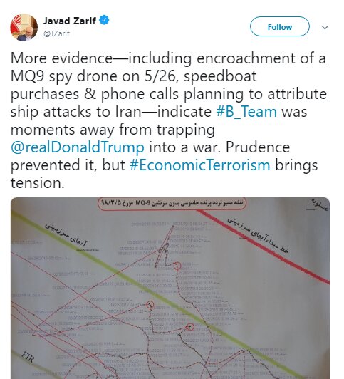 “More evidence—including encroachment of a MQ9 spy drone on 5/26, speedboat purchases & phone calls planning to attribute ship attacks to Iran—indicate B-Team was moments away from trapping Donald Trump into a war. Prudence prevented it, but economic terrorism brings tension,” Iranian foreign minister wrote in a Tweet on Sunday afternoon.