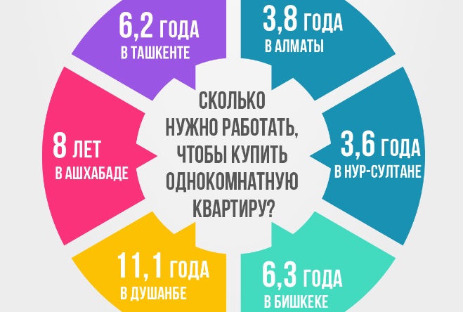 In Nur-Sultan, it will take 3 years and six months to make money for the cheapest one-roomed flat, in Bishkek – 6 years and three months, Ashgabat – 8 years, and in Tashkent – 6 years and two months.