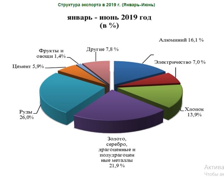 Over the report period, the share of ores in the country’s exports was 26 percent, aluminum – 16.1 percent, cotton fiber – 13.9 percent, electric power – 7.0 percent; cement – 5.9 percent, fruits and vegetables – 1.4 percent.