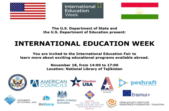 International Education Week will be celebrated around the world November 18-22, 2019. To help celebrate this event, the U.S. Embassy in Dushanbe is hosting an Education Fair at the National Library of Tajikistan today from 2:00 to 5:00 p.m. with a range of educational organizations including American Councils, EducationUSA, American Spaces, University of Central Asia, Cultural Centre Bactria, British Embassy, Public Organization Peshraft, Ilmhona, Open Society Institute Assistance Foundation and National Erasmus+ Office.