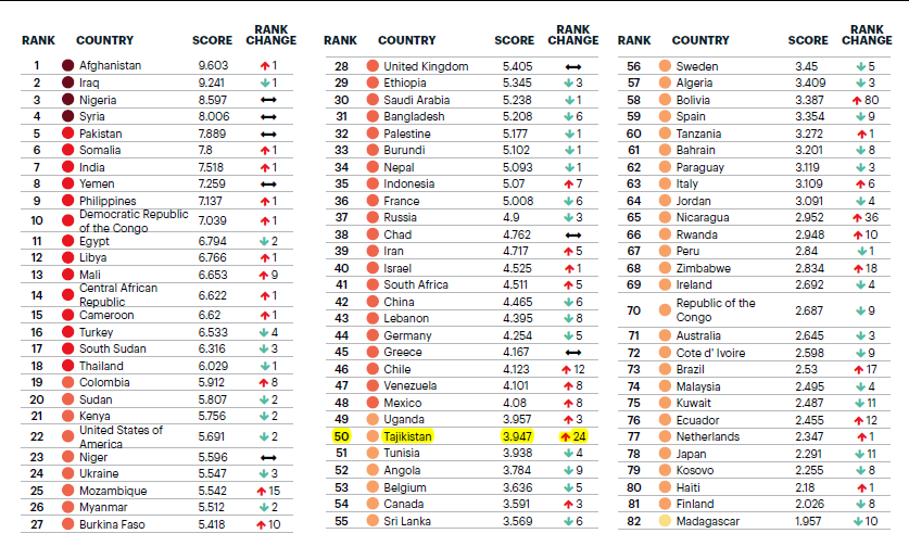 The 2019 Global Terrorism Index (GTI) ranks Tajikistan 50th among 163 countries. Tajikistan with 3,947 scores is listed among the countries with very low level of terrorism threat.
