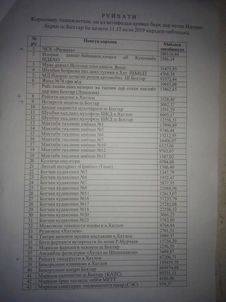 The Bokhtar electricity sales department has made a list of nonpayers. The list includes more than 100 state-run enterprises and private companies. More than 70 state-run enterprises, mostly health and education facilities, are on this list. According to Sharifzoda, the most incorrigible nonpayers are the state-run enterprises.