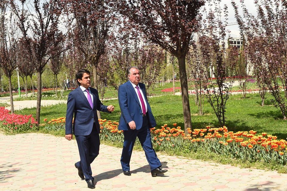 Tajik President Emomali Rahmon and Dushanbe Mayor Rustam Emomali today visited Dushanbe’s parks to get acquainted with the tree and flower planting situation.