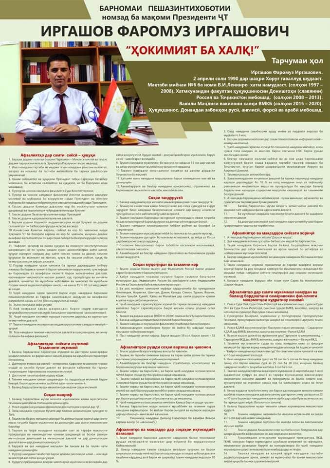 Little is known yet about Faromouz Irgashev. He was born in Khorog, the capital of GBAO, on April 2, 19190. In 2008, Irgashev finished local high school No 6. In 2013, he graduated from the Faculty of Law at the Russian-Tajik Slavic University (RTSU) in Dushanbe. From 2015 to 2020, he was member of the GBAO regional legislature (Majlis).