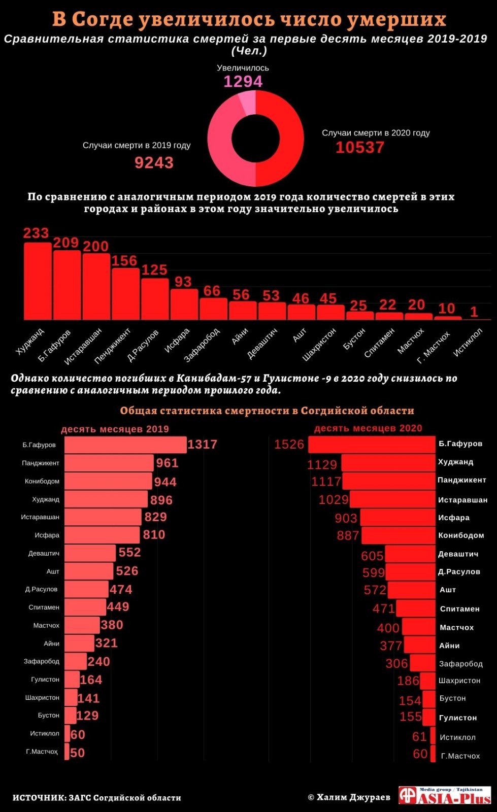 According to the statistical data from the Sughd civilian registry office, 10,537 deaths have been reported in Sughd province over the first ten months of this year, which is 1,294 deaths more compared to the same period last year.