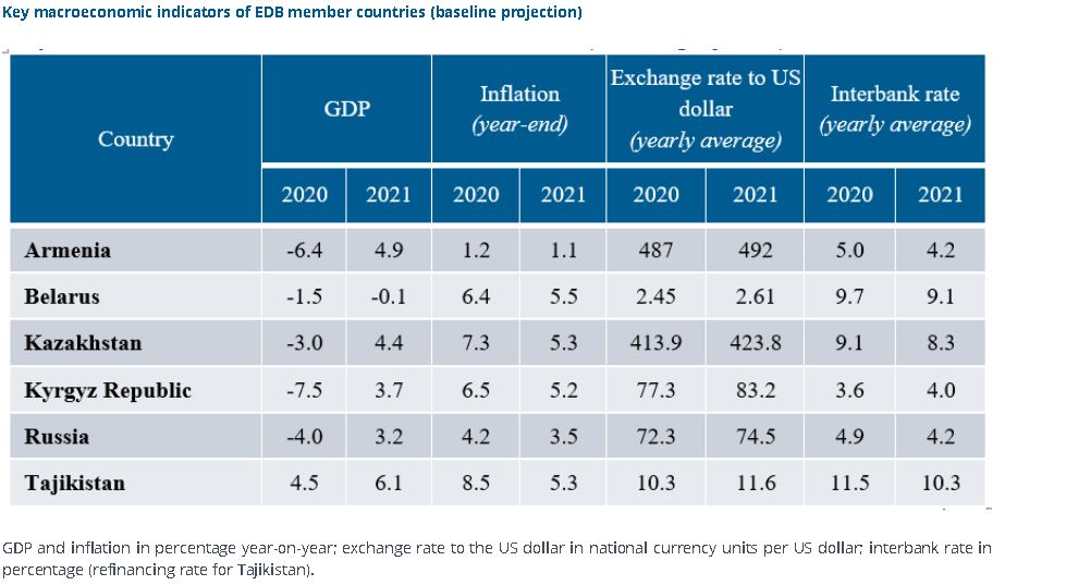 The Eurasian Development Bank (EDB) forecasts an increase in the aggregate GDP of its member countries by 3.2% in 2021, after a 3.8% decline in 2020.