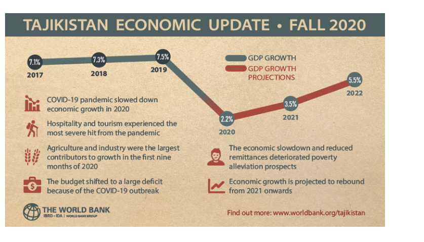 Tajikistan Economic Update – Fall 2020, in particular, notes that real GDP growth slowed to 4.2 percent year-on-year in the first nine months of 2020, compared to 7.2 percent a year earlier.