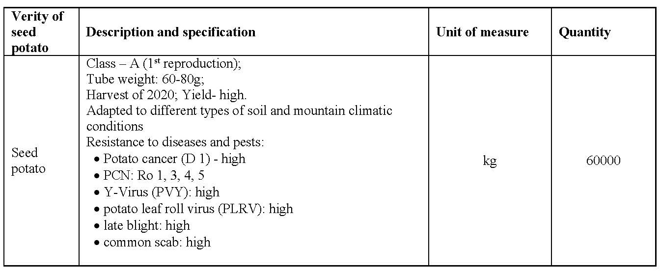 - Commercial offer, indicating the cost of seed potato (including all expenses related to import, certification and delivery to final destination mentioned above);