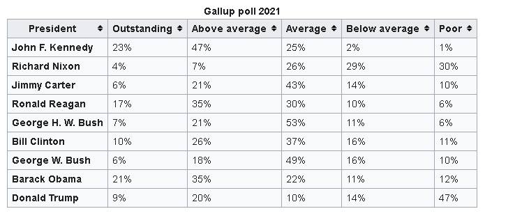 A Gallup poll taken January 4–15, 2021, asked 1,023 adults in the United States the following question: "How do you think each of the following presidents will go down in history—as an outstanding president, above average, average, below average, or poor?”